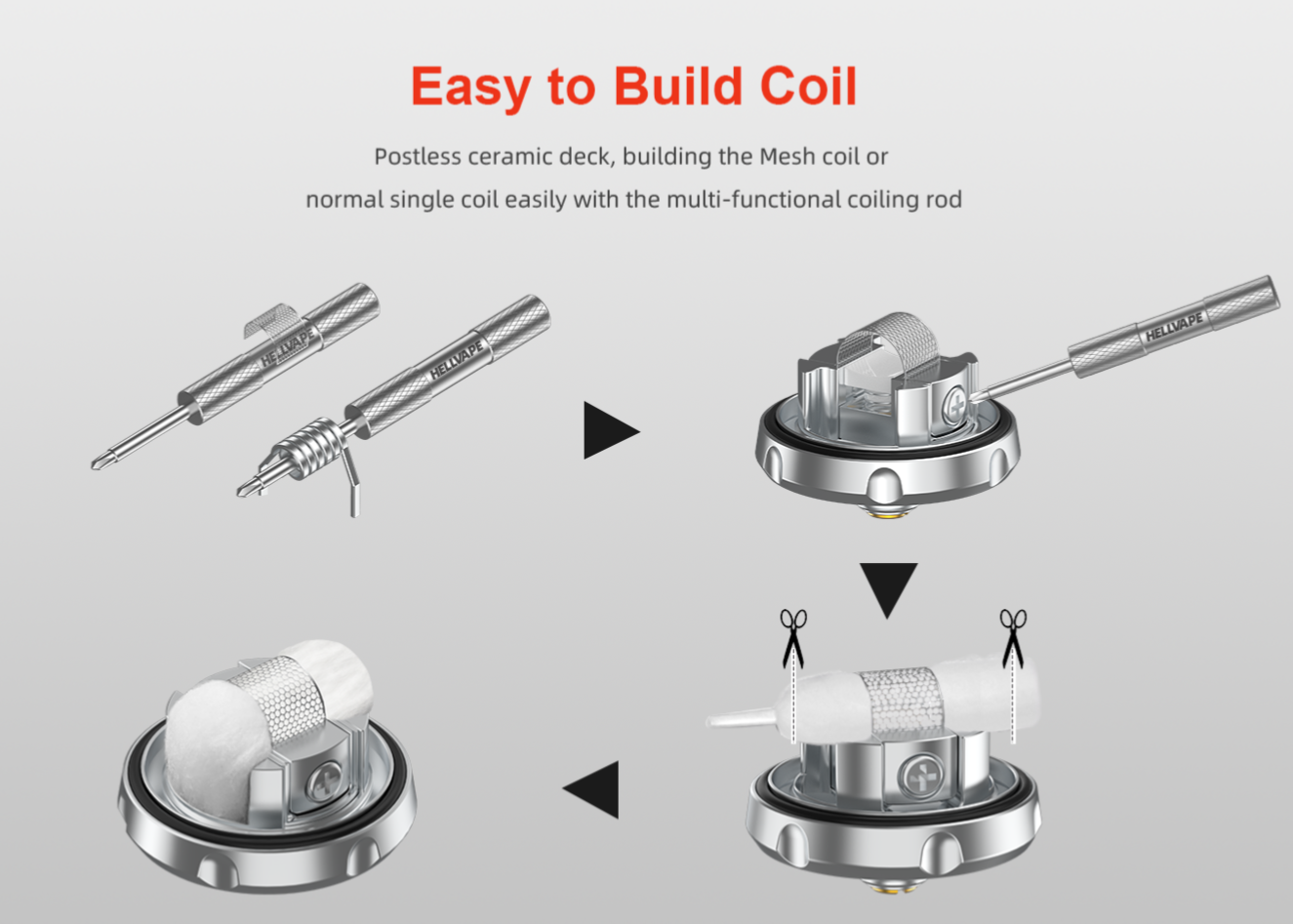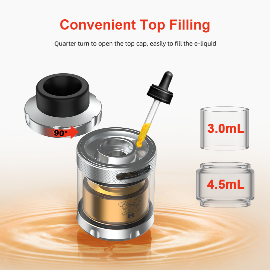 Really easy for users to fill the e-liquid, just quarter turn to open the top cap. What's more, the tank can use both pre-built coils and mesh coils, and the postless ceramic deck can build with both mesh coil and normal single coil easily with the multi-functional coiling rod.